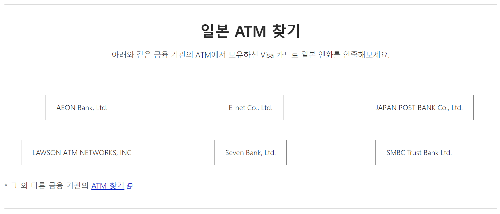 최근 여행을 많이 가는 일본에서는 AEON은행, 세븐은행(세븐일레븐), 로손은행(로손 편의점)과 VISA가 협약을 맺고 있습니다. 따라서 AEON 또는 세븐일레븐, 로손편의점을 발견하시면 그 편의점 내의 ATM에서는 ATM 출금이 가능합니다. (월 500USD 한도내에서 수수료없이 출금가능, 1회 최대 400USD, 1일 최대 1,000USD, 월 최대 2,000USD 까지 인출 가능)