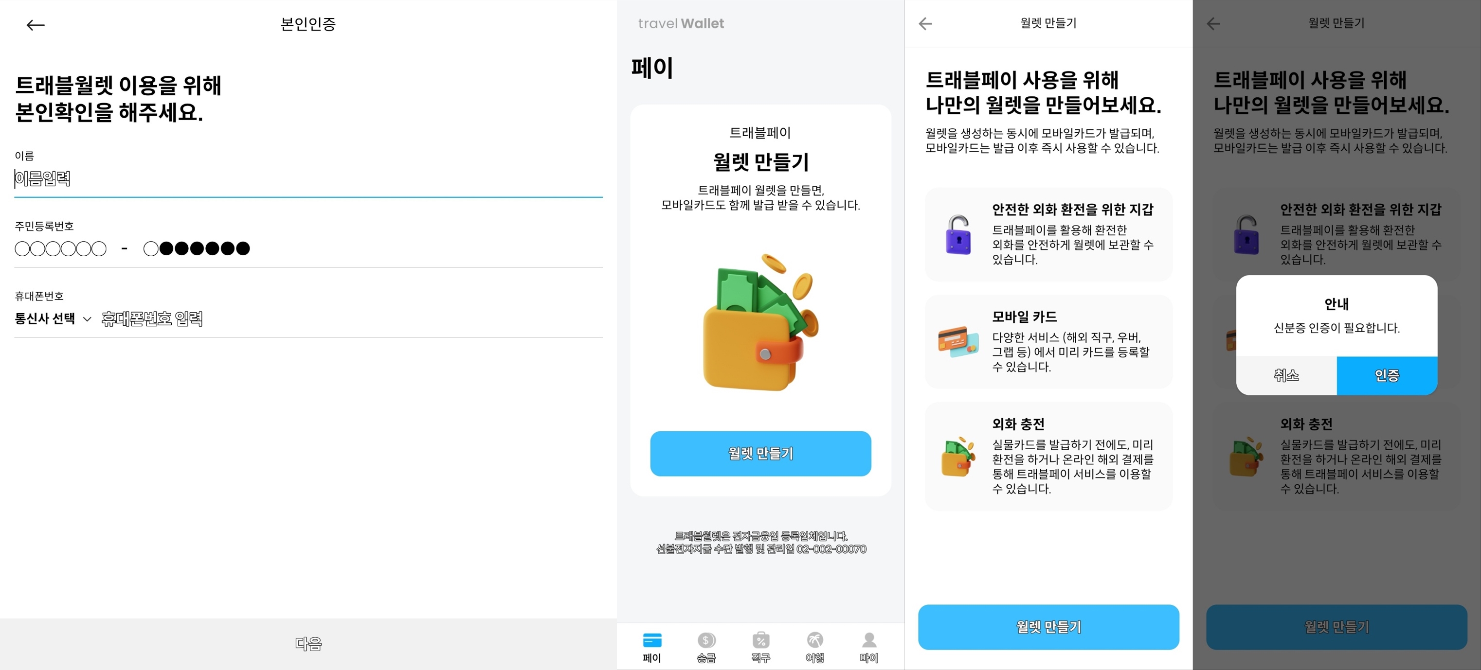 우선 가장 먼저 트래블월렛 앱을 다운로드 받으셔야 합니다. 트래블월렛 앱을 다운로드받으시려면 아이폰은 앱스토어, 안드로이드는 구글 스토어에 들어가서 '트래블 월렛' 앱을 다운로드 받으시면 됩니다. 트래블 월렛을 다운로드 받으시고 앱에 접속하시게 되면 가장 먼저 위와 같이 본인확인 과정이 진행됩니다. 이름과 주민등록번호, 휴대폰 번호를 입력하고 인증 받으시면 첫번째 가입절차는 끝나게 됩니다. 두번째로 우리가 해외에서 사용해야 할 트래블페이 월렛을 만드셔야 하는데, 트레블 페이 월렛을 만들게 되면 이 지갑을 통해서 외화 환전과 온라인 모바일 상 카드사용(모바일 카드), 외화 충전 등이 가능해지게 됩니다. 트래블페이 월렛을 만들기 위해서는 신분증 인증이 필요하니, 주민등록증 또는 자동차면허증을 준비하시고 촬영을 진행하시면 됩니다.