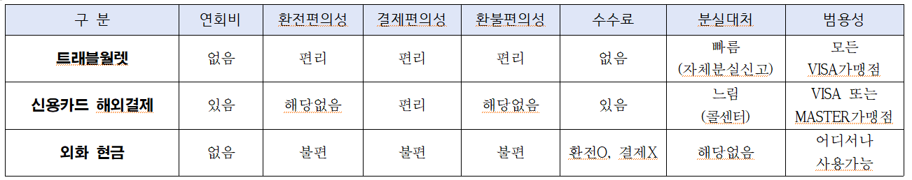 다음은 트래블 월렛과 신용카드 해외결제, 외화 현금의 장점을 비교한 표입니다.
