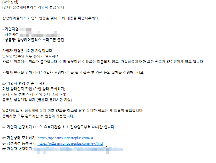 가입자 변경(양도)를 신청할 수 있는 방법은 2가지로, 삼성케어플러스온라인보상센터 홈페이지(https://www.samsungcareplus.co.kr/) 내 '1:1 문의하기'에 접수를 하시거나, 삼성케어플러스 대표번호(1566-4590)으로 연락하여 상담원분께 문의를 하는 방법이 있습니다.