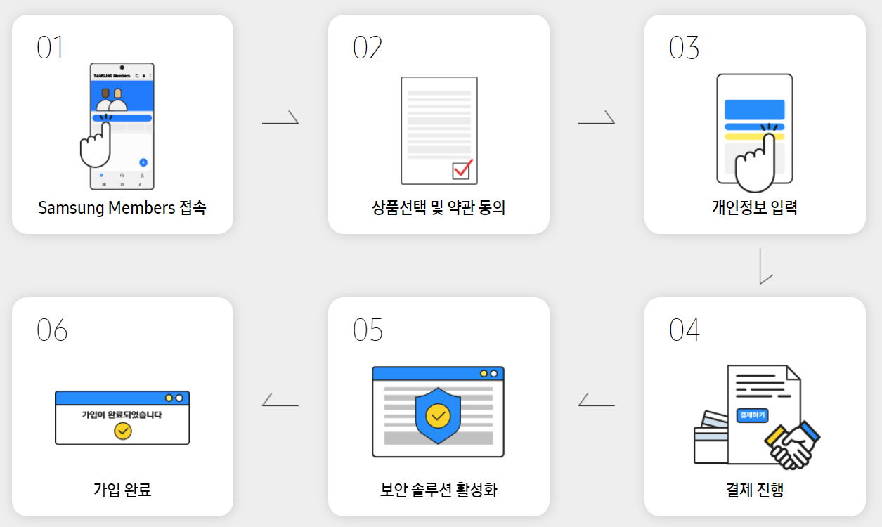 [삼성멤버스 앱 접속 - 상품선택 및 약관동의 - 개인정보 입력 - 결제 진행 - 보안 솔루션 활성화]의 절차를 진행하면 삼성케어플러스 서비스에 가입이 완료됩니다. 삼성케어플러스 서비스는 월 서비스이용료 결제 방식으로 진행되며, 2개월 이상 미납시 서비스가 자동적으로 해지되니 이 점은 꼭 유의하셔야할 것 같습니다.