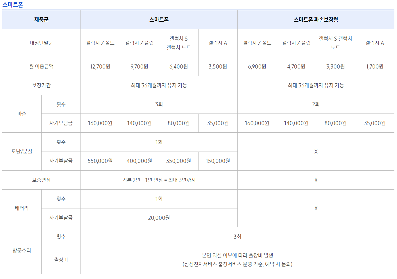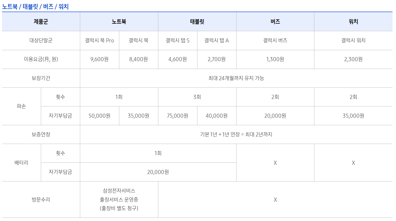 삼성 스마트폰의 경우 기본 보증기간이 2년이고, 계절성 가전제품을 제외한 나머지 전자제품의 경우에는 1년이 기본 보증기간입니다. 그러나 삼성케어플러스에 가입할 경우 스마트폰은 3년, 태블릿, 갤럭시 워치, 갤럭시 버즈같은 제품의 경우에는 2년까지 보증기간이 연장됩니다. 삼성의 우수한 제품 품질로 인해 3년은 너끈히 사용하는 요즘, 가장 필요한 서비스가 아닐까 싶습니다.