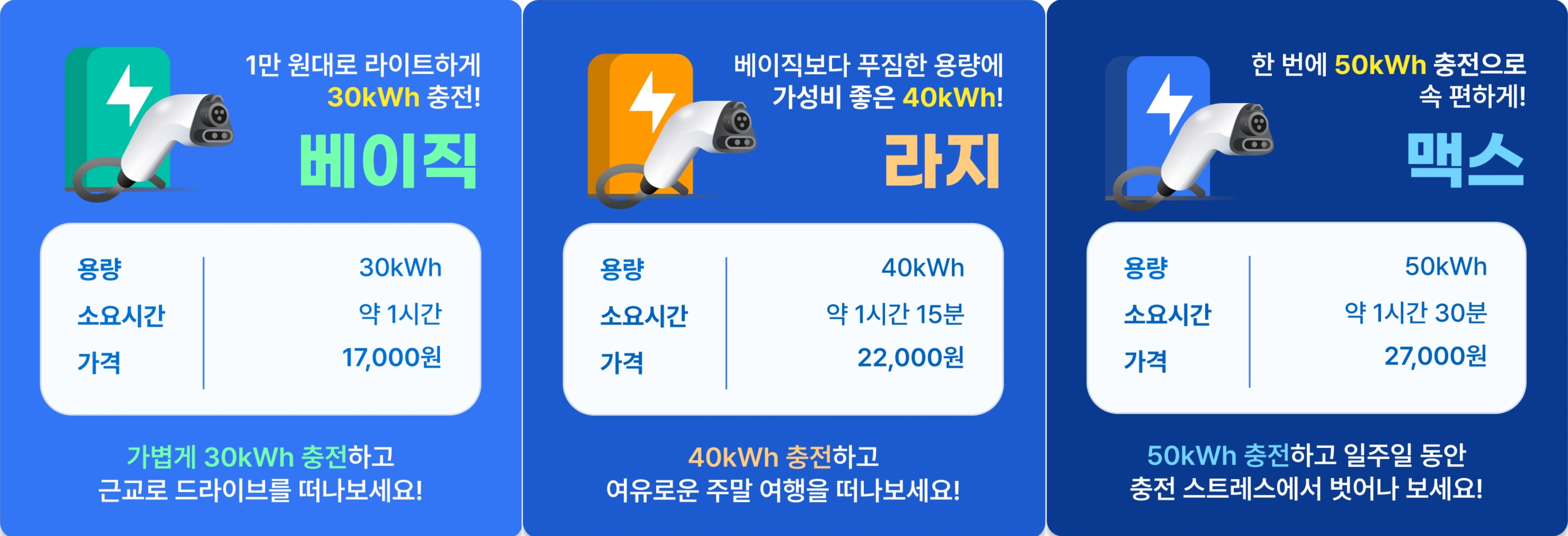 해당 절차로 진행됩니다. 현재 배달비를 포함하여 충전량으로 요금을 계산하고 있으며, 베이직 요금제인 30kWh는 17,000원, 라지 요금제인 40kWh는 22,000원, 맥스 요금제인 50kWh는 27,000원으로 요금이 책정되어있습니다. 고정 충전기에서 충전하는 요금보다 비싼 것은 사실이지만, 일렉베리의 키위포인트로도 결제가 가능한만큼 주변에 충전기가 없는 긴급 또는 비상상황에서는 유용하게 쓰일 것 같습니다.