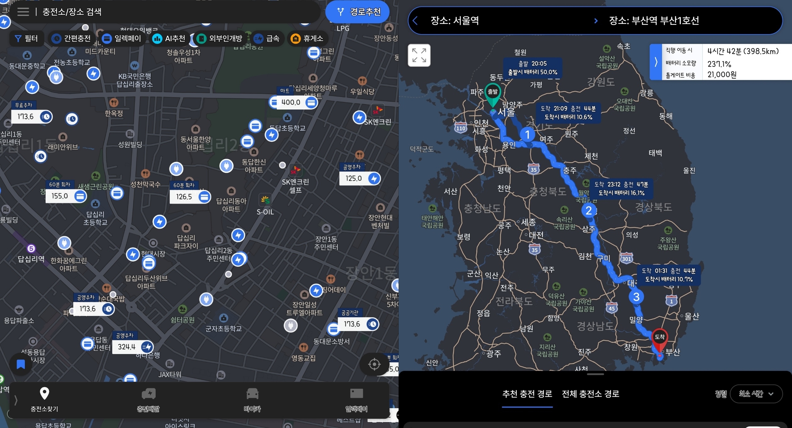 2) 전기차 충전 정보 제공(충전 정보 표시, 충전 경로 추천)