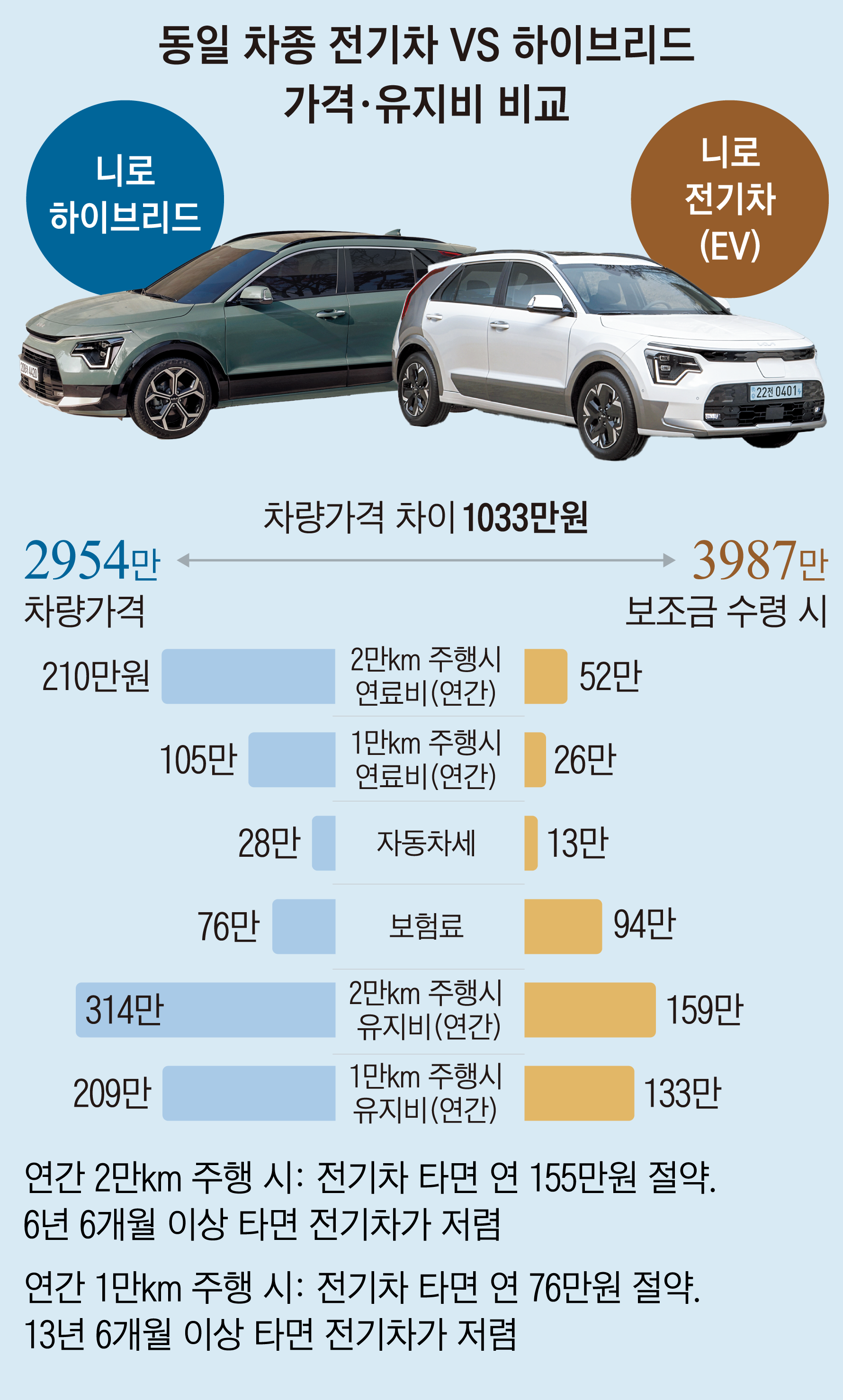 동일차종인 니로 하이브리드와 니로EV 전기차만 비교해봐도 가격 차이가 확연히 나는 것을 알 수 있습니다. 니로 하이브리드는 2954만원인 반면, 니로EV 전기차는 보조금을 수령하더라도 가격이 3987만원에 달합니다. 차량가격 차이만 하더라도 대략적으로 천만원 차이가 납니다.