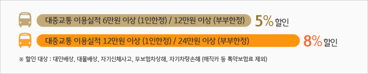 3) 대중교통 할인 특약: 다음은 대중교통 이용금액에 따라 할인율을 적용하는 특약제도입니다. 해당 특약은 현재 KB손해보험만 존재하고 있습니다. 대중교통 이용실적이 6만원 이상인 경우 5%, 12만원 이상인 경우 8% 할인되며, 부부명의로 가입할 경우 해당 실적금액은 배로 달성해야 할인율이 적용됩니다.