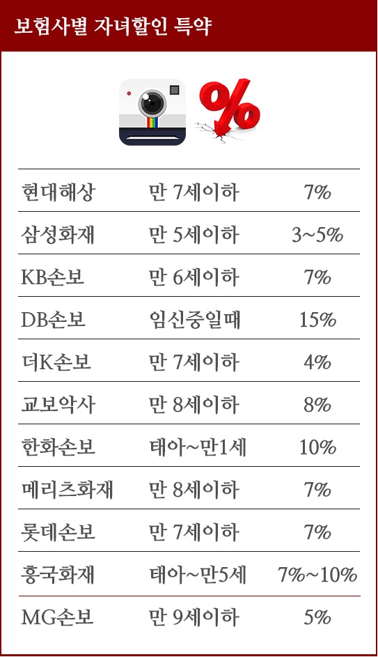 2) 자녀할인 특약: 보험 가입시 어린 자녀가 있는 운전자에 한해 보험료를 할인해주는 특약입니다. 어린자녀를 차에 태운 30-40대 운전자들의 운전성향이 안전운전을 지향하기때문에 사고위험이 낮다는 것에 기인해 만들어진 특약입니다.