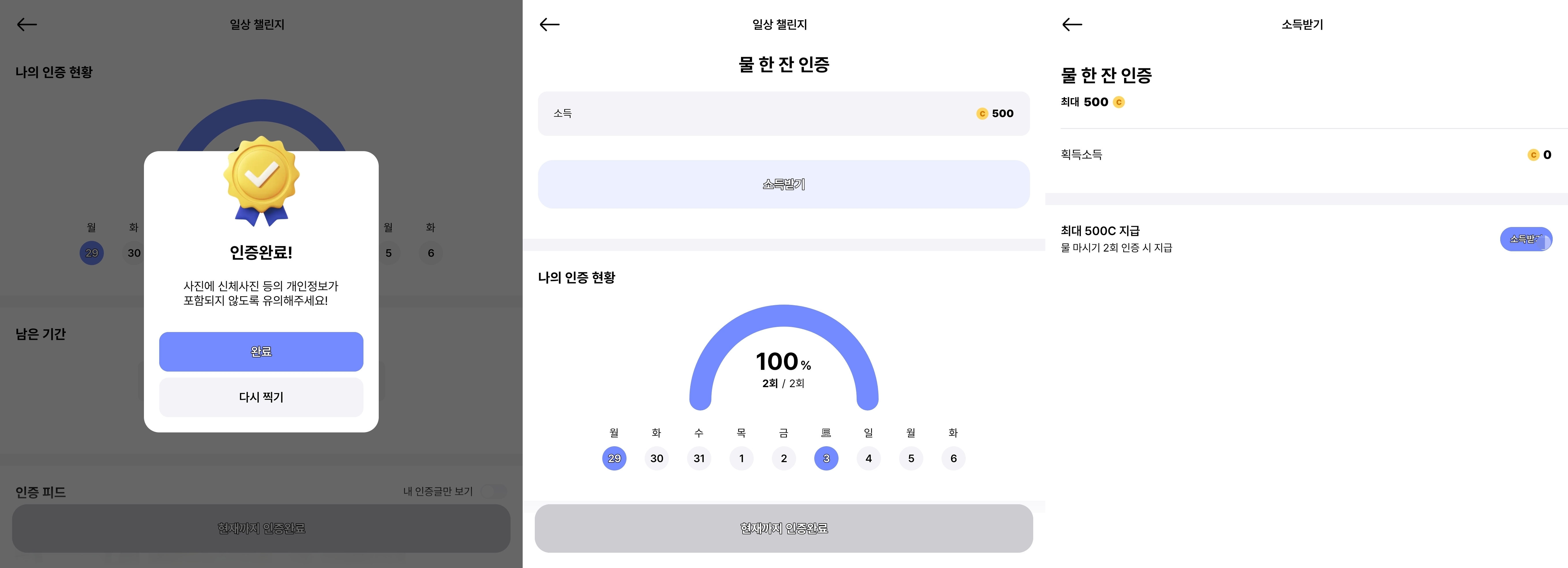 앱 상에서 물 잔 사진을 찍고 인증을 완료한 사진입니다. 물 한 잔 인증을 총 2번하여 인증을 완료한 후 포인트를 지급받습니다. 포인트는 미션당 최대로 얻을 수 있는 포인트가 정해져 있으며, 최대포인트는 잘 나오지않고 랜덤하게 지급됩니다.