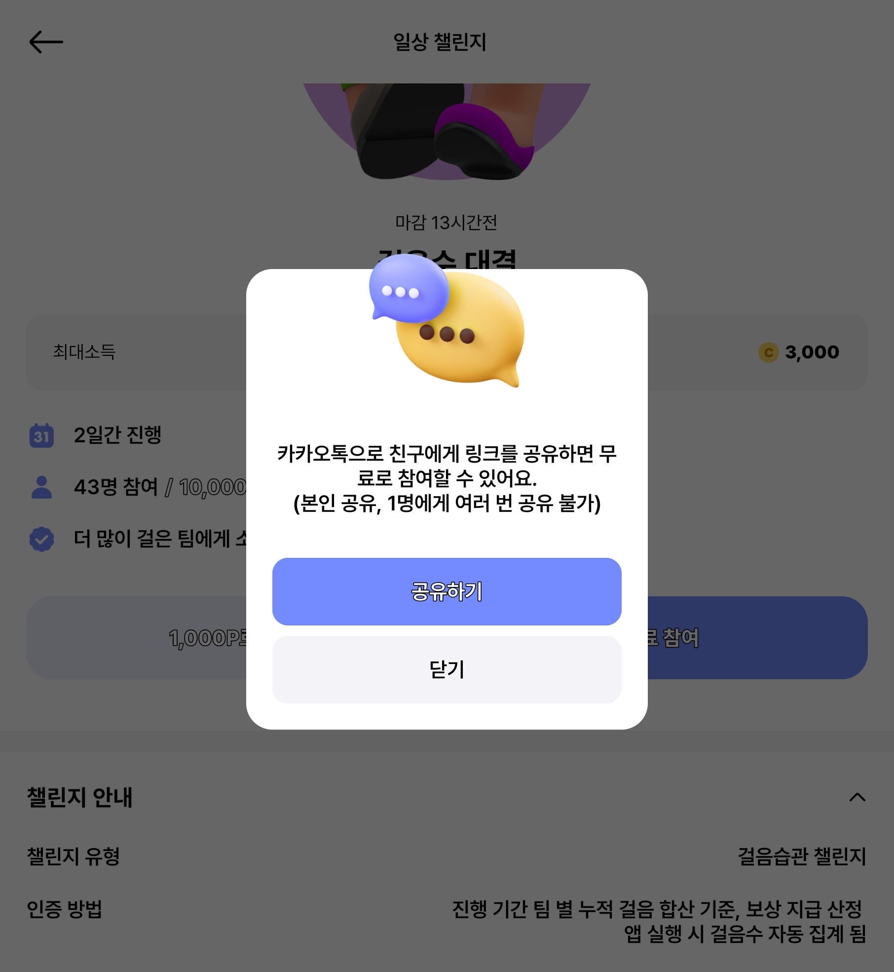 발로소득 미션 무료참여를 위해서는 이렇게 카카오톡으로 친구에게 링크를 공유해야 합니다. 지금은 일상지원금 이벤트로 일주일마다 3000P를 나누어주고 있어, 공유없어도 3번까지는 무료 참여 가능하니 참고하시면 좋을 것 같습니다.