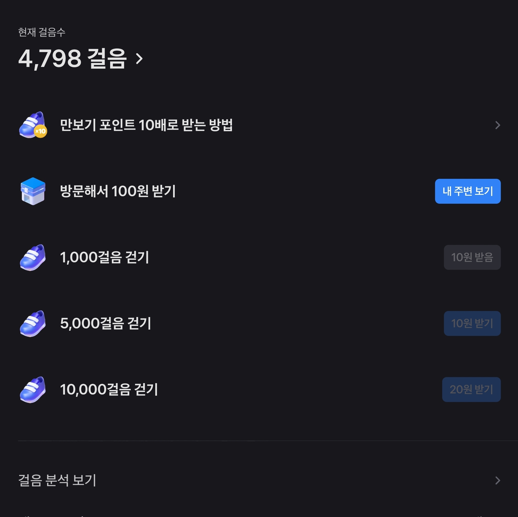 일단 돈이나 포인트를 벌려고 앱테크를 진행하는 건데 돈을 벌려고 가상의 신발을 사서 운동을 하고 지급받는다니, 이런 분들은 많이 안 계실 것 같아서 단순히 걸음으로 적립할 수 있는 내용만 말씀드리겠습니다.