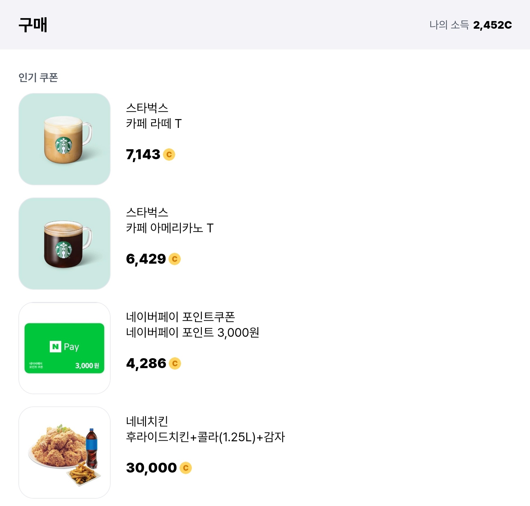 다음은 발로소득 앱에서 포인트로 구매할 수 있는 쿠폰들입니다.