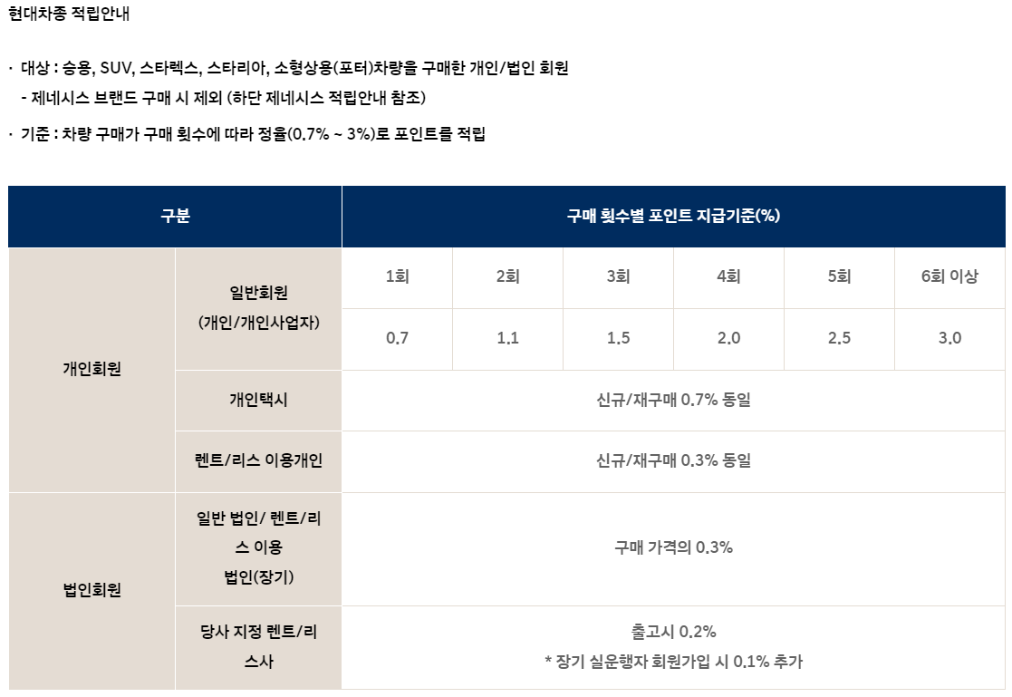 현대자동차는 신차 구매시 구매가에 비례해 일정 퍼센티지로 블루멤버십포인트를 적립해줍니다.