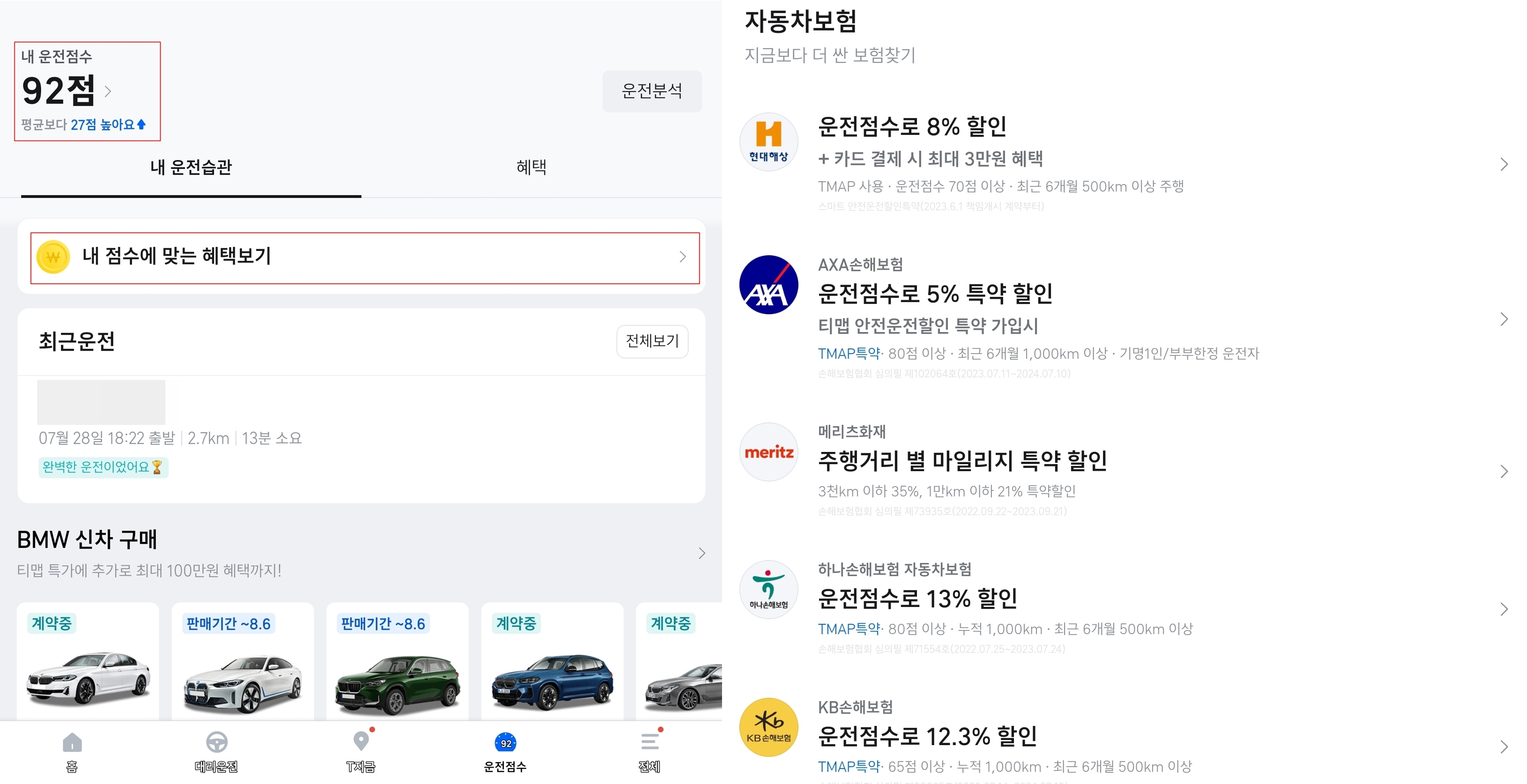 티맵 내비게이션 앱 하단에 있는 [운전점수] 탭을 클릭하여 운전점수를 확인, 내 점수에 맞는 혜택 보기를 클릭하면 우측 사진처럼 가입할 수 있는 자동차보험 목록이 나타나게 됩니다. 신규로 가입하시는 경우에는 보험사별 할인요건을 확인하여 가입을 진행하시면 되고, 기존 자동차보험이 있으나 중도에 특약만 가입하여 추가 할인으로 환급받고 싶으신 분들은 기존 자동차보험 할인요건을 확인하고, 충족하시면 클릭하여 진행하시면 됩니다.