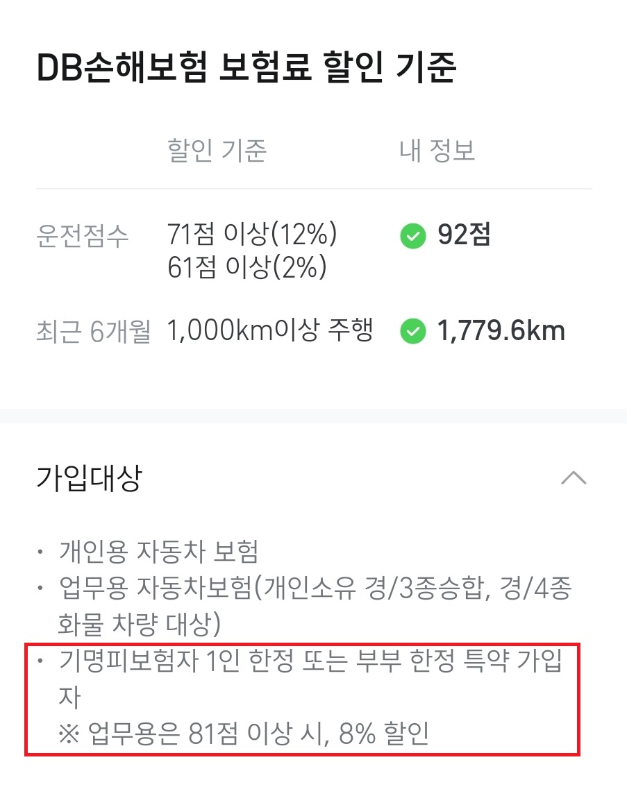 또한 추가적으로 운전자범위 요건이 모든 보험사에 포함되어 있었는데, 운전자범위가 기명피보험자 1인이거나 부부한정이어야 해당 할인특약을 가입할 수 있었습니다. 기존에 자동차보험을 가입한 사람이라도, 중도가입시 운전자범위를 누구나, 혹은 가족범위에서 그 즉시 기명피보험자 1인 한정 또는 부부 한정으로 운전자범위를 변경한다면 안전운전할인특약 가입이 가능합니다. 저 역시 가족범위였으나, 콜센터를 통하여 운전자범위를 기명피보험자 1인으로 변경하여 특약가입을 진행하였습니다.